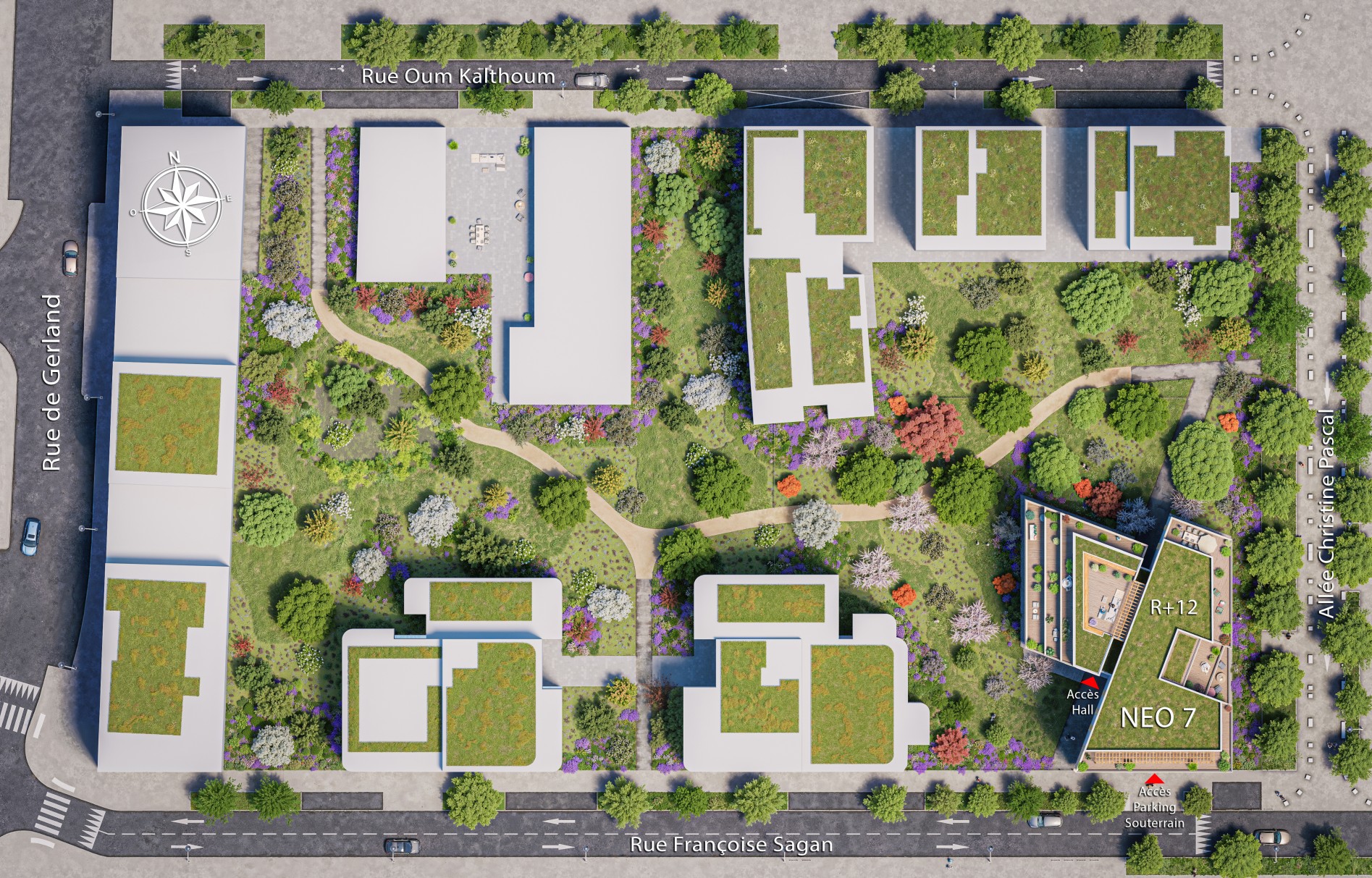 À la croisée de l’allée Christine Pascal et de la rue Françoise Sagan, Néo7 s’élève comme un signal fort, vert et contemporain, qui se détache en ligne de crête du quartier.