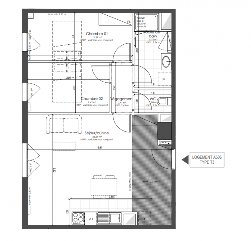 421 300€ Appt. T3 57.71m2 5ème
