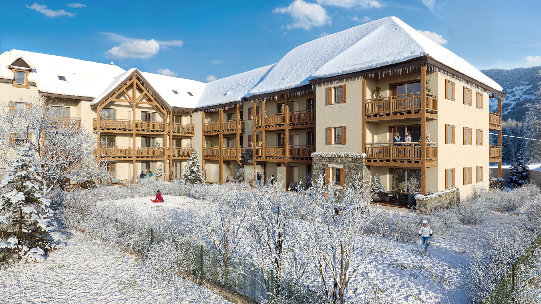 La résidence s'intègre harmonieusement dans le paysage grâce à son architecture pyrénéenne traditionnelle mêlant ardoise, pierre et bois. La résidence intimiste se compose de 36 appartements de standing, du studio au T3 bis duplex, tous prolongés par des extérieurs agréables : jardin en rez-de-chaussée ou balcon aux étages. Chaque appartement dispose d'une place de stationnement, et la copropriété est équipée de casiers à skis, d'un local à vélos, et de celliers.